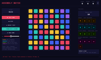 Match 3 blocks of the same color to gain points. Build a machine to perform matching. Once your machine is ready, finalize it to run it for a randomized 50 turn cycle. Then, try to optimize your machine for a high score.